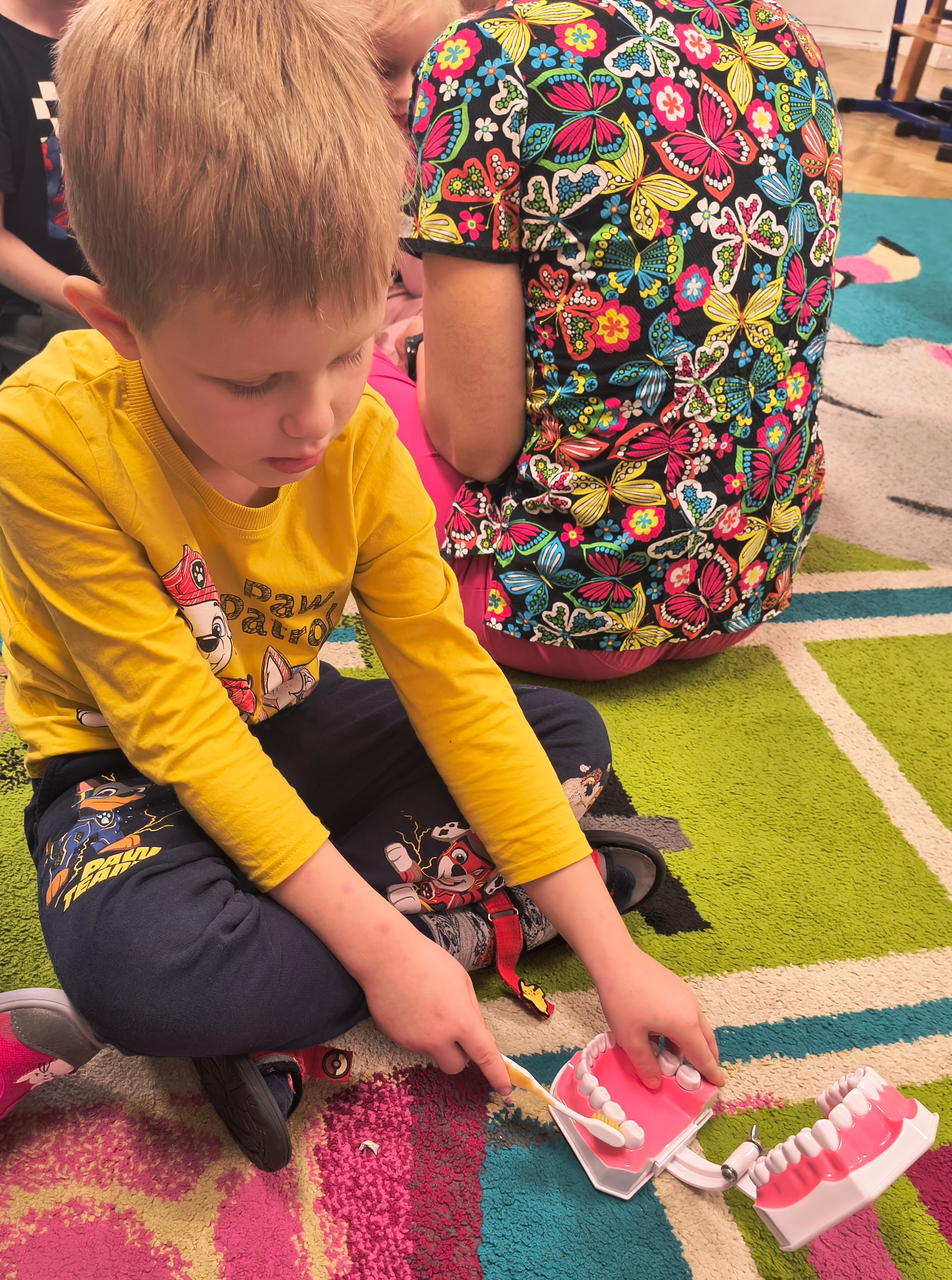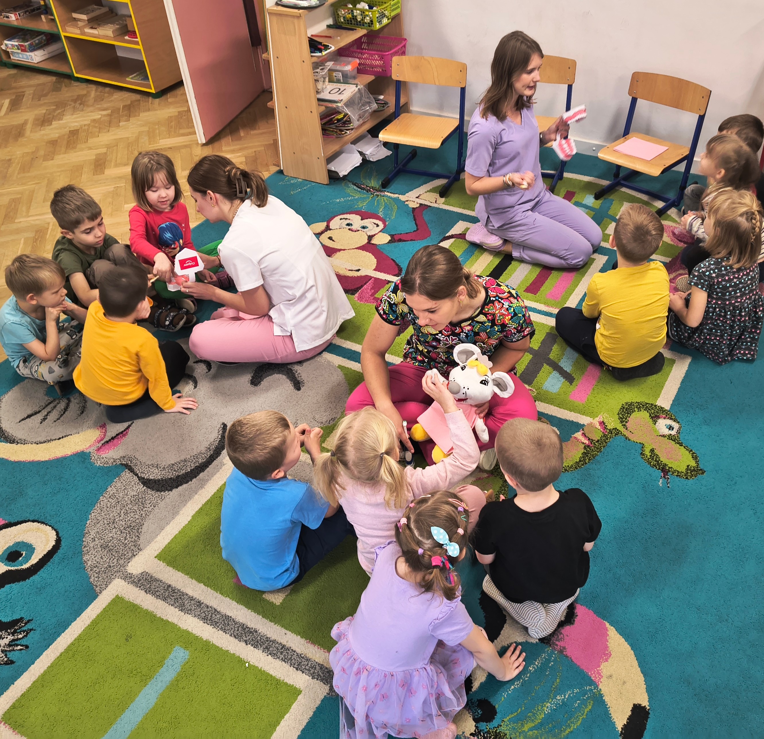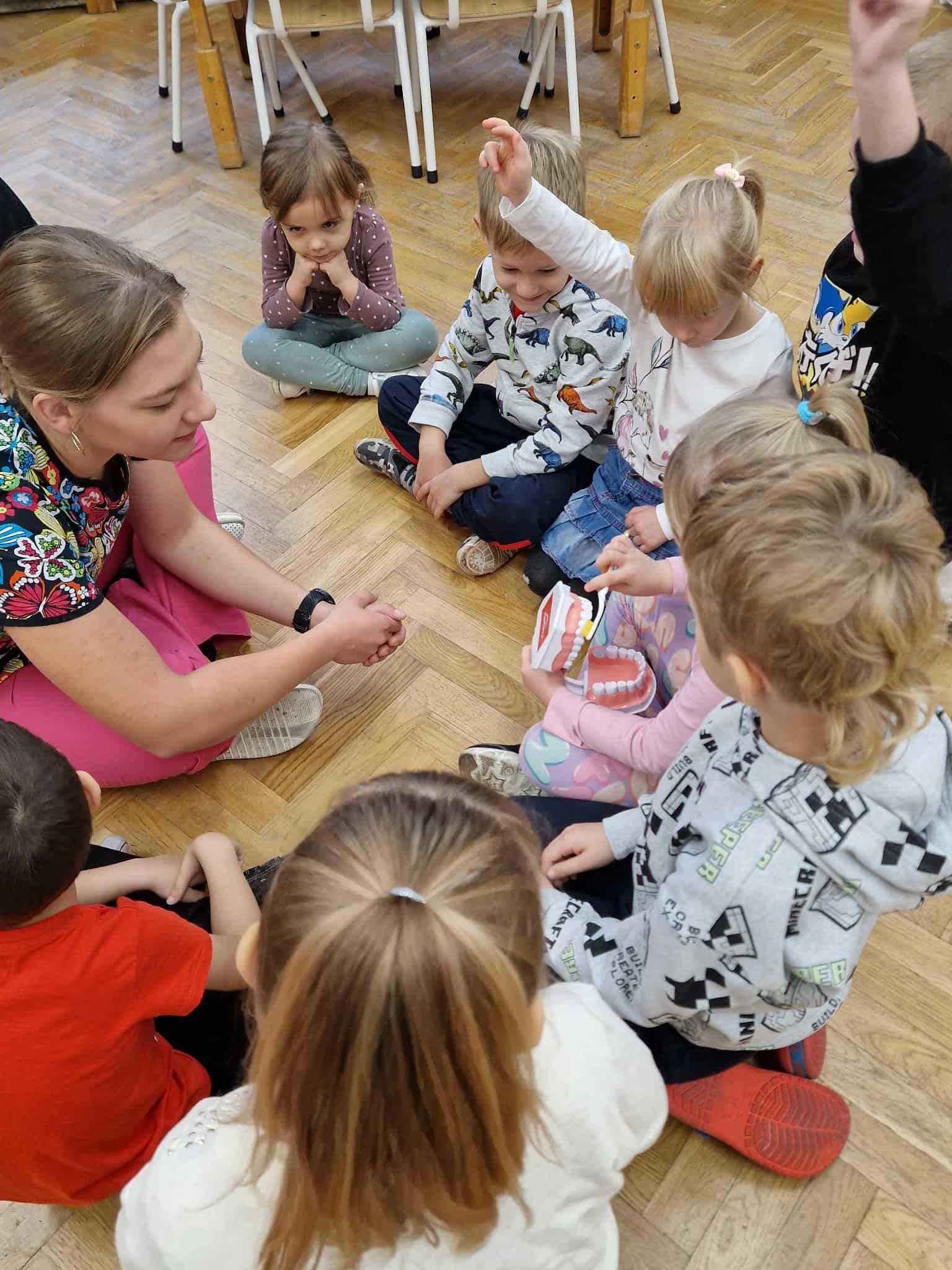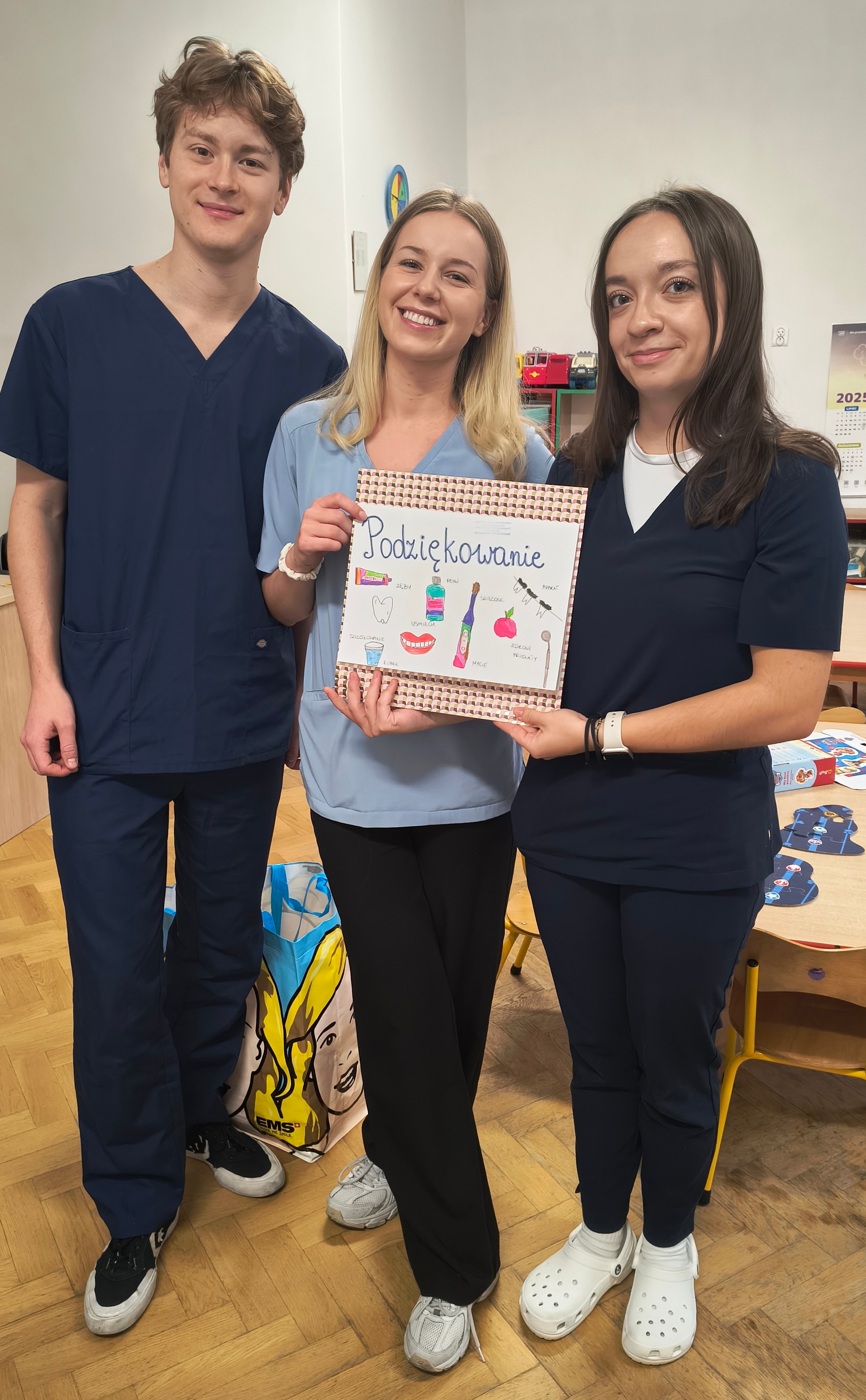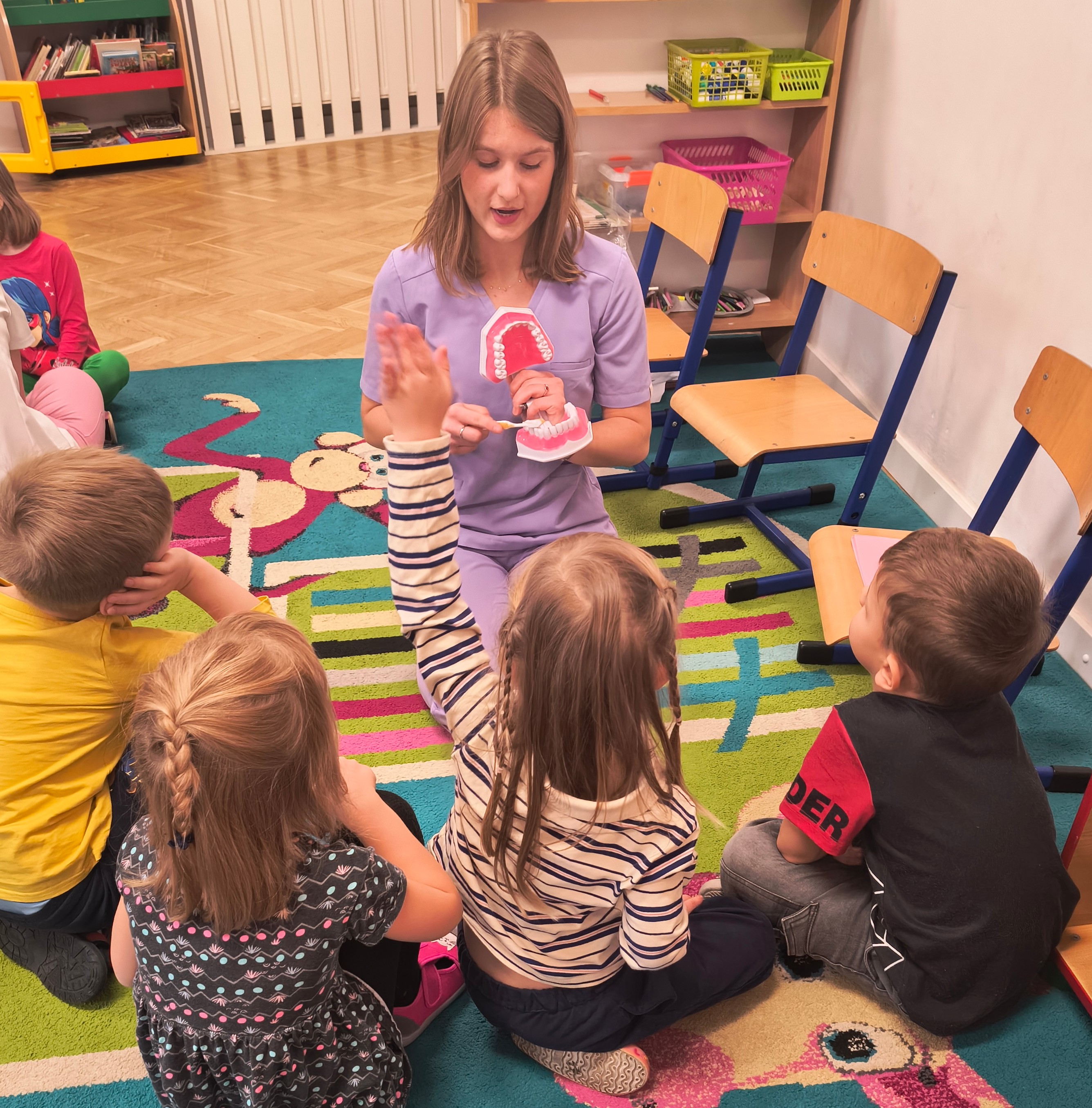 Nasze przedszkole odwiedzili studenci z Polskiego Towarzystwa Studentów Stomatologii - oddział w Łodzi. Studenci pokazali jak prawidłowo myć zęby, następnie każde dziecko mogło spróbować swoich sił na modelu szczęki. Na koniec zajęć każdy przedszkolak za udział w spotkaniu otrzymał pastę, naklejkę oraz kalendarz. Studentom stomatologii bardzo dziękujemy za wizytę, ciekawe zajęcia oraz upominki