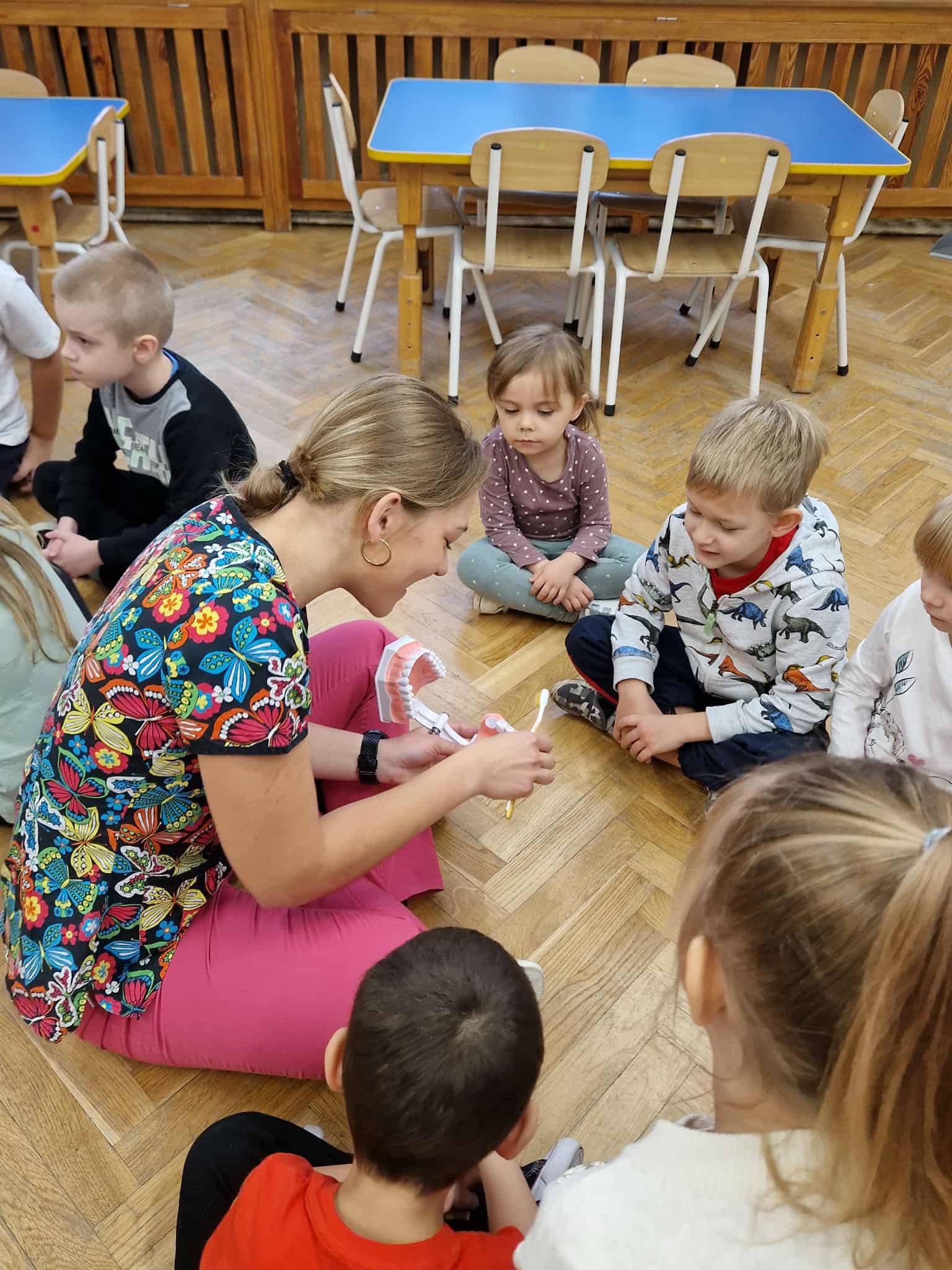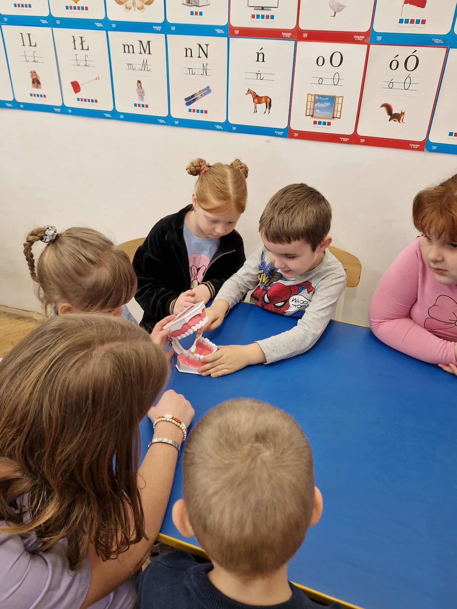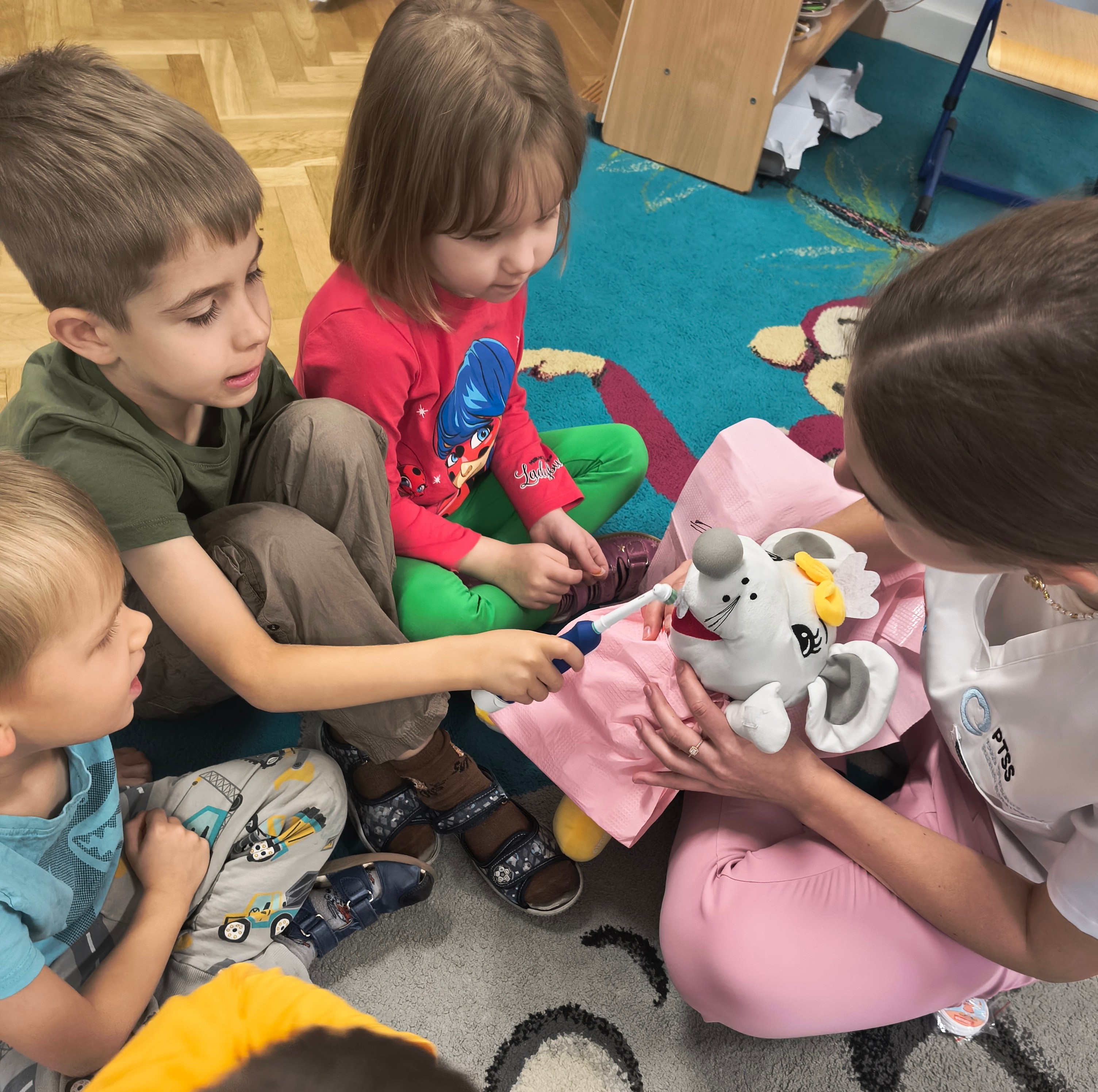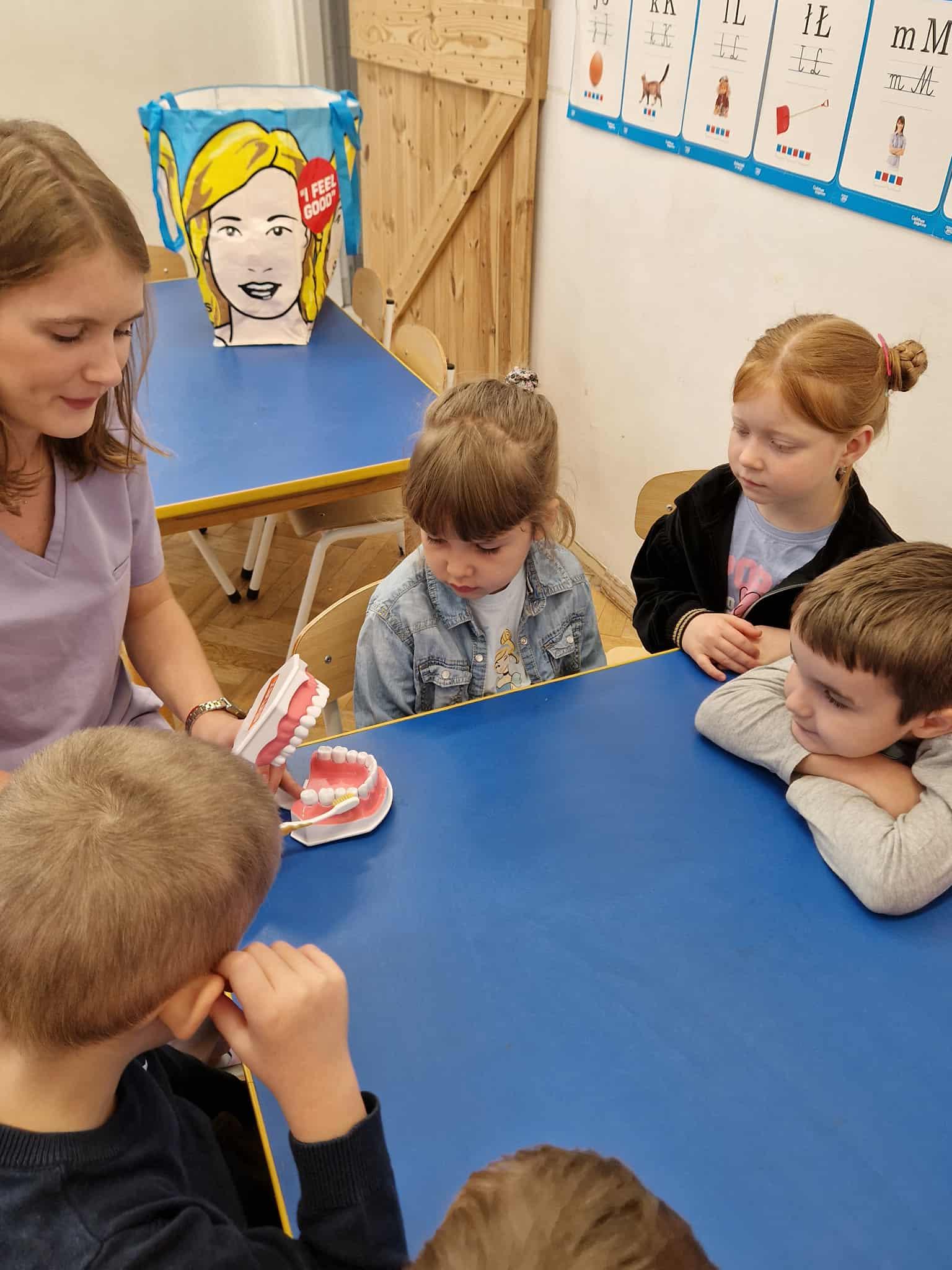 Nasze przedszkole odwiedzili studenci z Polskiego Towarzystwa Studentów Stomatologii - oddział w Łodzi. Studenci pokazali jak prawidłowo myć zęby, następnie każde dziecko mogło spróbować swoich sił na modelu szczęki. Na koniec zajęć każdy przedszkolak za udział w spotkaniu otrzymał pastę, naklejkę oraz kalendarz. Studentom stomatologii bardzo dziękujemy za wizytę, ciekawe zajęcia oraz upominki