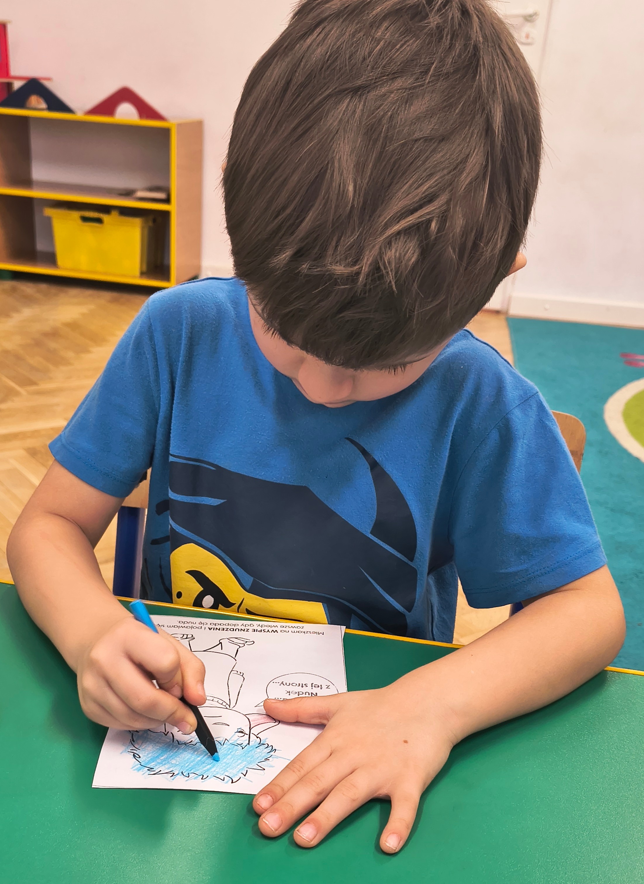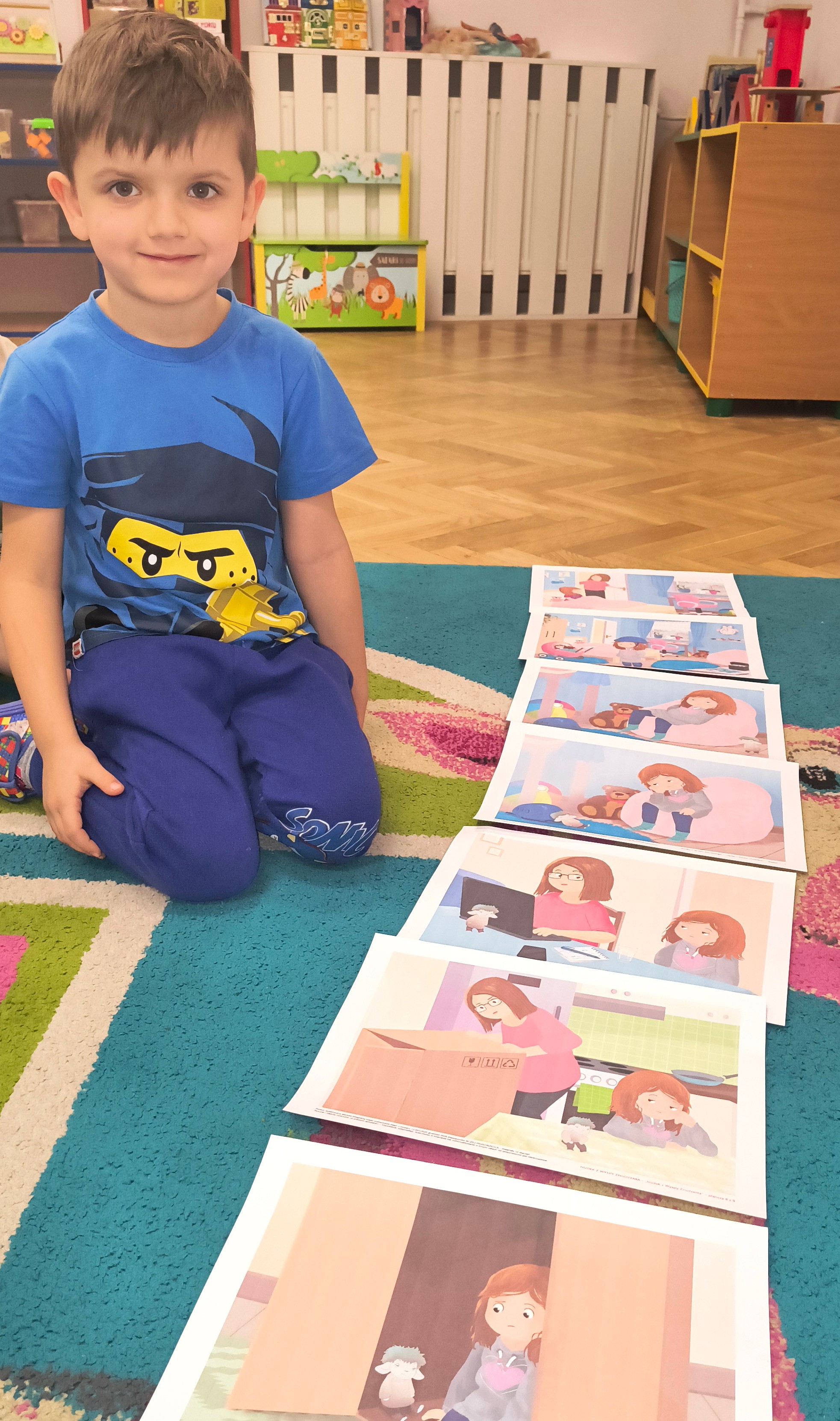 Grupa wysłuchała bajki edukacyjne, układała i opowiadała historyjkę obrazkową, zapoznała się ze sposobami radzenia ze strachem, grała w emocjonalną grę planszową oraz wykonała pracę techniczną „Teatrzyk cieni”. Wszystko zakończone było kolorowaniem postaci według wzoru i wklejaniem jej do książeczki emocjonalnej.