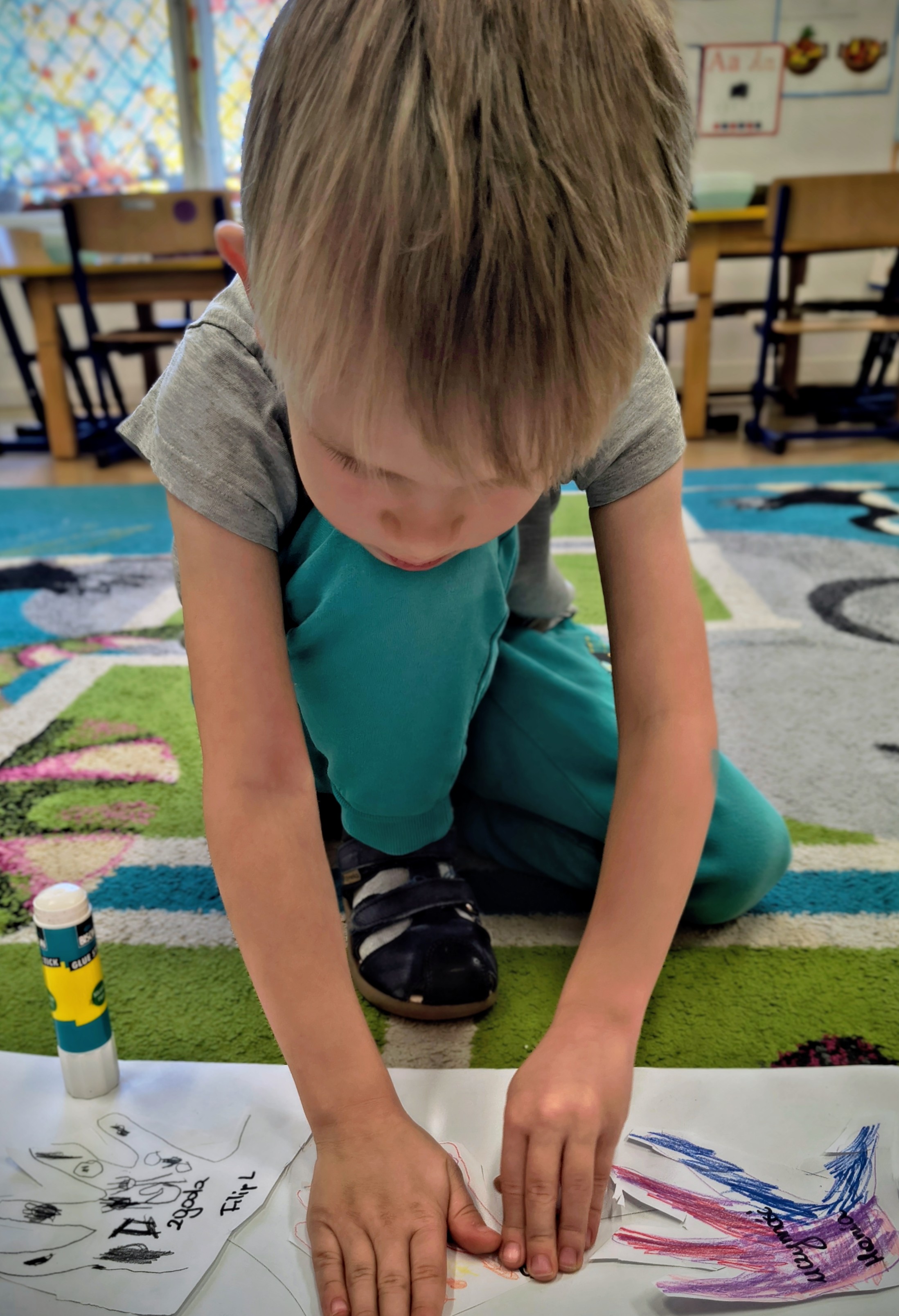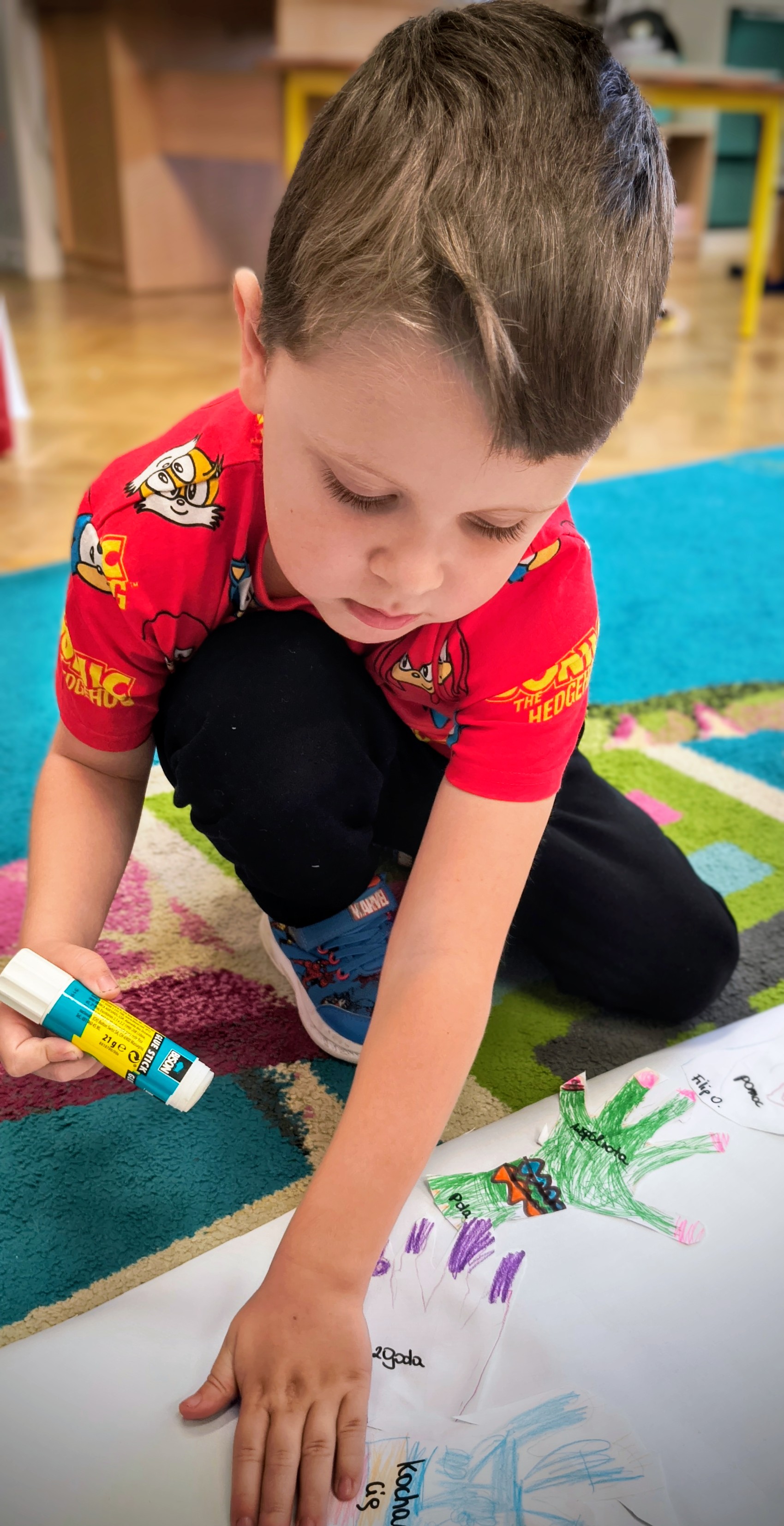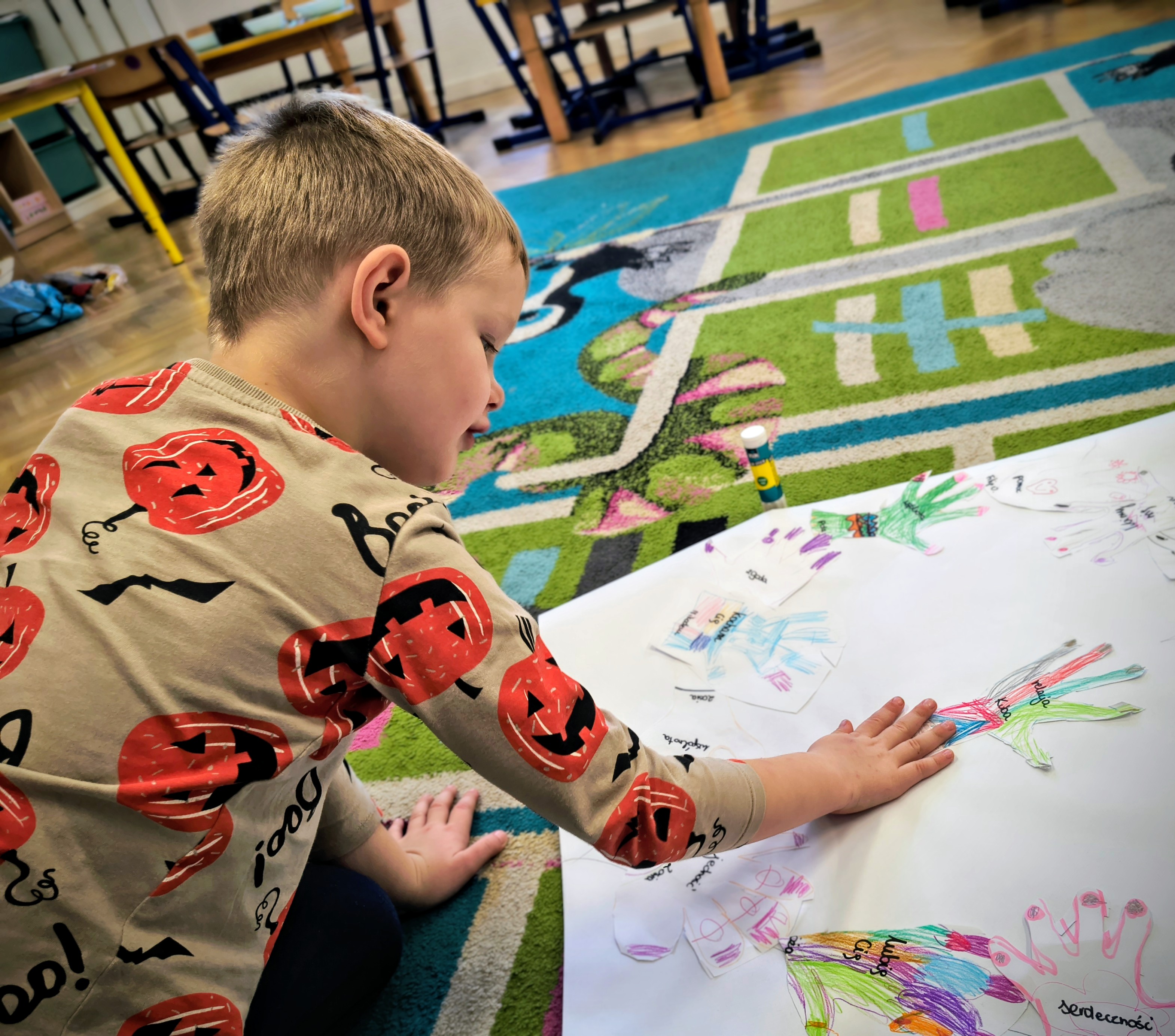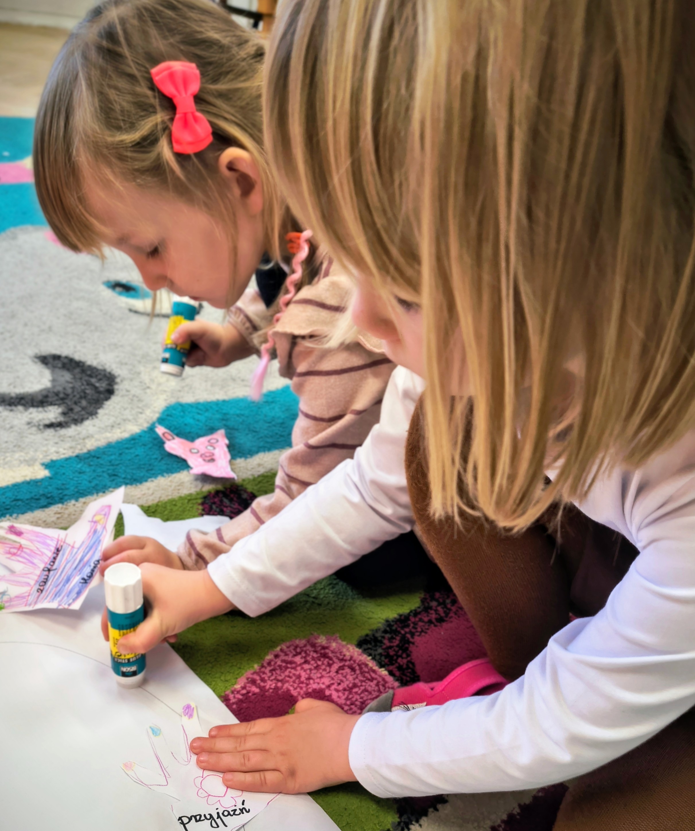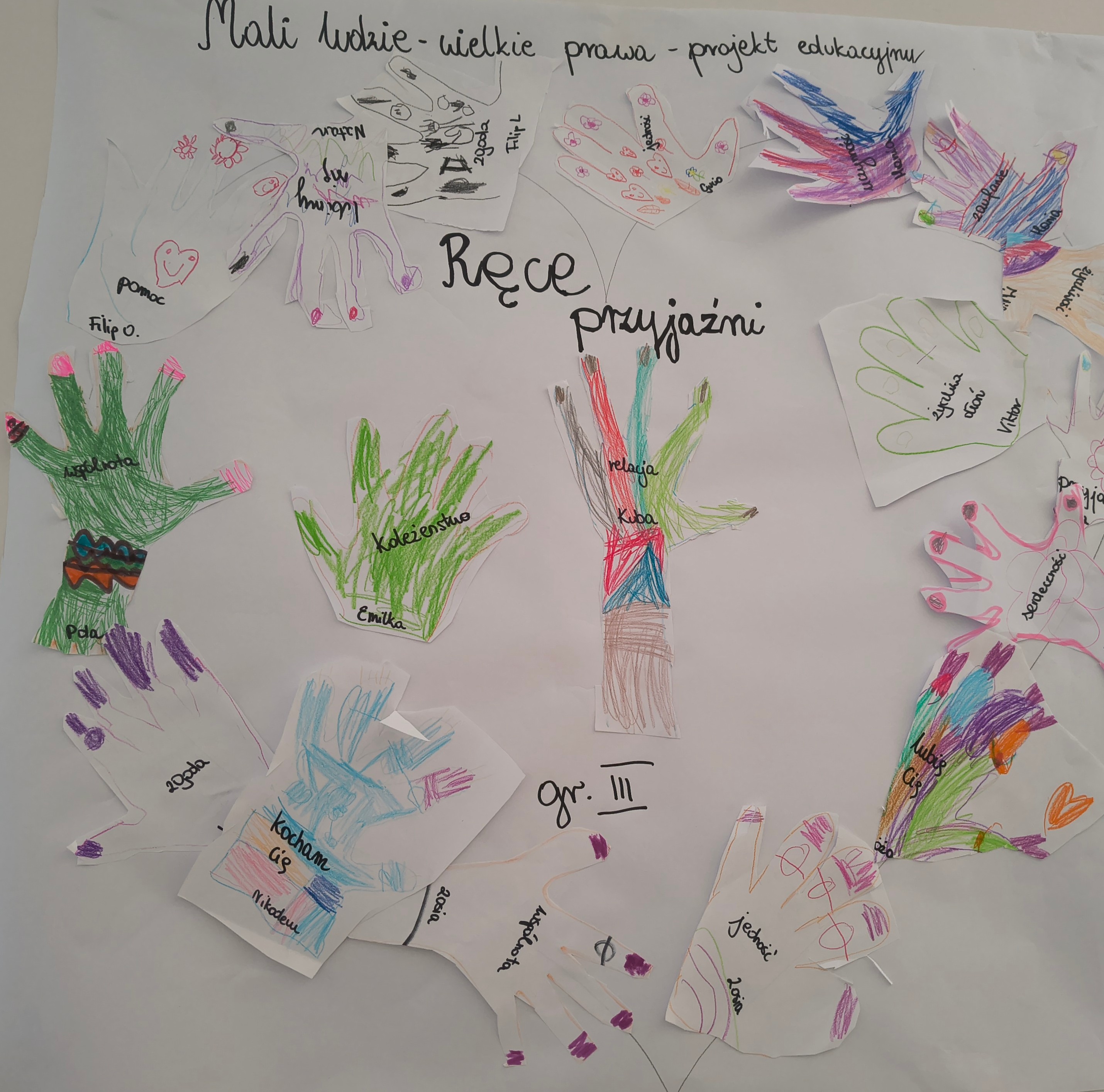 Dzieci z gr. III podczas realizacji Ogólnopolskiego Projektu Edukacyjnego- Mali ludzie- wielkie prawa odrysowywały, ozdabiały i określały miłym słowem swoje wycięte dłonie tworząc wspólny plakat symbolizujący jedność, przyjaźń i współpracę w grupie- ,, Ręce przyjaźni".