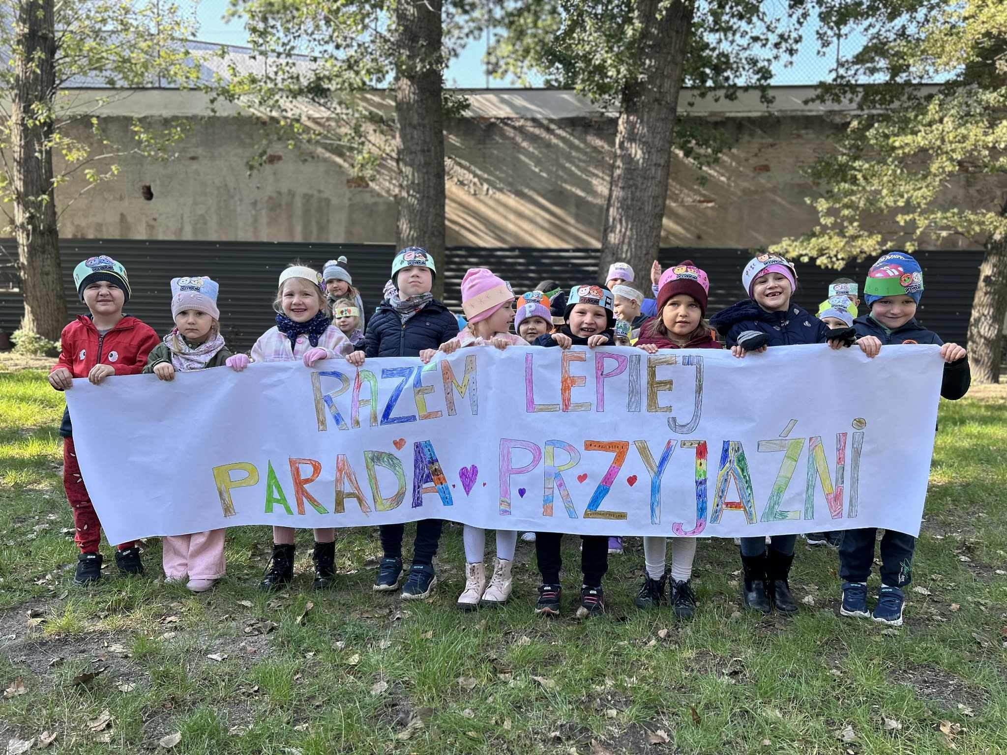 Wzięliśmy udział w marszu ,,Parada Przyjaźni", dzieci trzymały w rączkach stworzony przez siebie transparent. Maszerowaliśmy śpiewając piosenkę ,,Przedszkole to jedna rodzina".